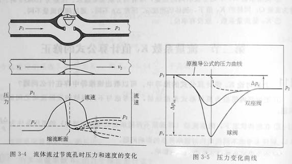 當流體流過調節閥時,其中壓力變化如圖3-4所示,可知在閥芯、閥座處由于節流作用而在附近的下游處產生一個縮流,其流體的流速大,但靜壓小。在遠離縮流處,隨著閥內的流通面積的增大,流體的流速減小,由于相互摩擦,部分參量轉變成內能,大部分靜壓被恢復,形成了閥門壓差。換言之,流體在節流處的壓力急劇下降,并在其后的節流通道中逐漸恢復,但已經不能恢復到原來的P1值。這便是壓力恢復現象。
