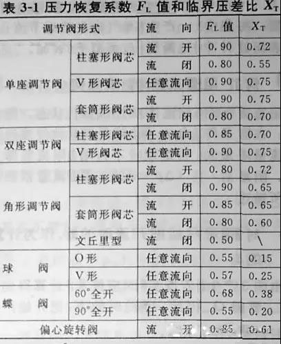 知FL是在閥門產生閃蒸時閥前后壓差△Pc與縮流處壓差△Pvc之比。用透明閥體做試驗將會發現,當節流處產生閃蒸,即在節流處產生氣泡群時,Q就基本上不隨著△P的增加而增加。這個試驗說明:產生閃蒸的臨界壓差就是產生阻塞流的臨界壓差,測定此時的閥前后壓差△Pc和縮流處壓差△Pvc,便可求得壓力恢復系數FL,FL值的大小取決于調節閥的結構形狀。由試驗確定的各類閥的FL值見表3-1