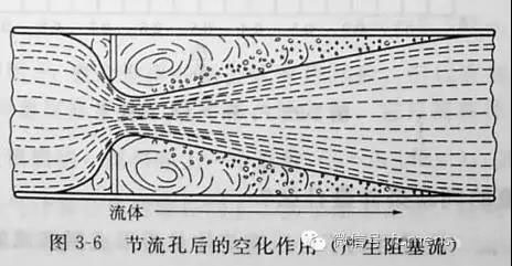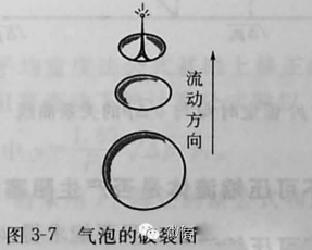 一是產生阻塞流,如圖3-6所示,許多氣泡集中在閥的節流孔后,阻礙流體的流動,自然影響了流量的增加,即產生了阻塞情況。二是產生汽蝕,如圖3-7所示,產生空化作用時,在縮流處的后面由于壓力恢復,升高的壓力壓縮氣泡,達到臨界尺寸的氣泡開始變為橢圓形,接著在上游表面開始變平,然后突然爆裂。所有的能量集中在破裂點上,產生極大的沖擊力。如果氣泡在接近節流孔后的固體表面處破裂,這種沖擊力會慢慢地撕裂材料表面,形成類似于煤渣的粗糙表面。