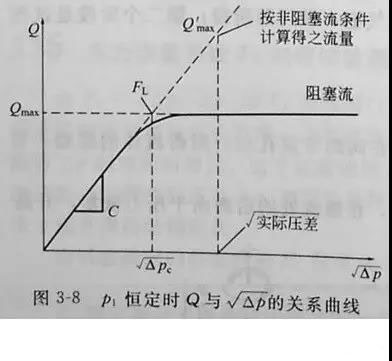 由圖3-8可見,產生阻塞流時,若按實際壓差計算,對應按非阻塞流條件計算得到的流量Q'max要比阻塞流量Qmax大許多。因此,為了求得此時的Kv值,只能把開始產生阻塞流時的閥壓隆