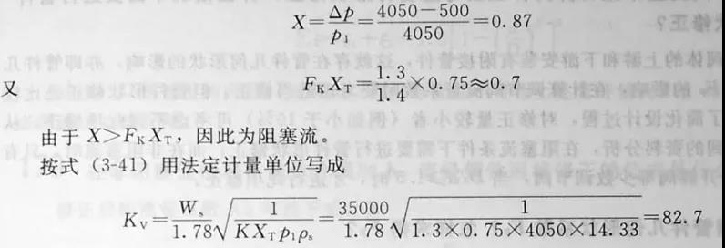 蒸氣質量流量Ws=35000kg/h,p1=4050kPa,p2=5000kPa,絕熱指數K=1.3,t=368℃,ρs=14.33kg/m3。若選用套筒調節閥,求流量系數。解 查表3-1得,XT=0.75