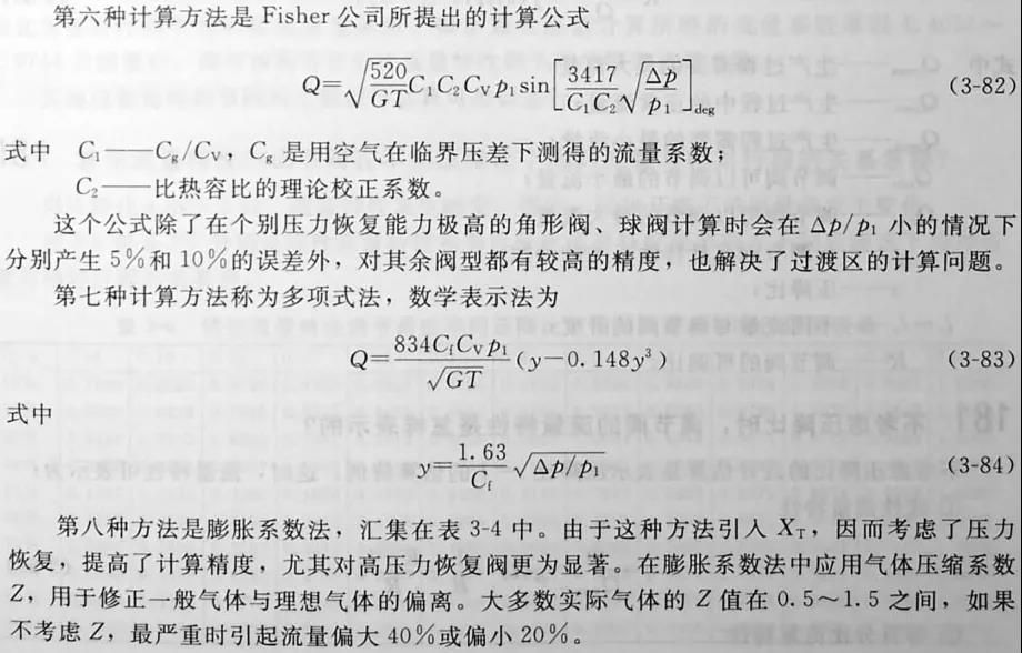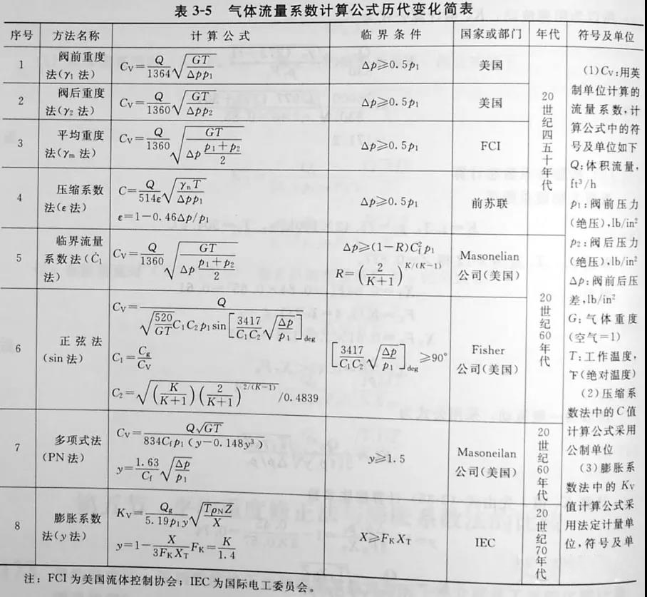 對流量系數公式的分析與比較關鍵在于對可壓縮流體公式的比較。從表3-5中看出不同計算公式的考慮因素各不相同,但畢竟都以原來的液體計算公式為基礎?梢园堰@些公式分成早期公式和近期公式兩大類型。在所列的8種公式中,前4種屬于早期,而后4種屬于近期。在早期的計算公式中,流量系數用CV或C表示,并用重度(ϒ )代替密度(ρ)計算。因此,使用和理解這些公式都要注意它的單位。