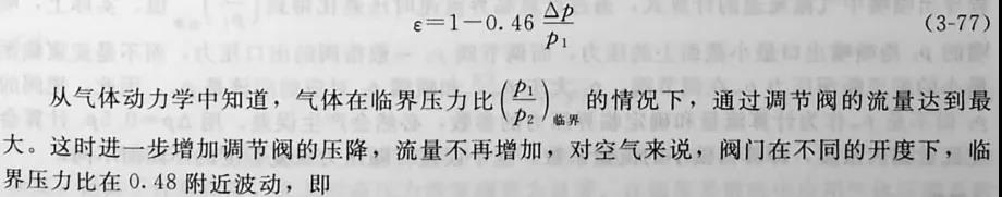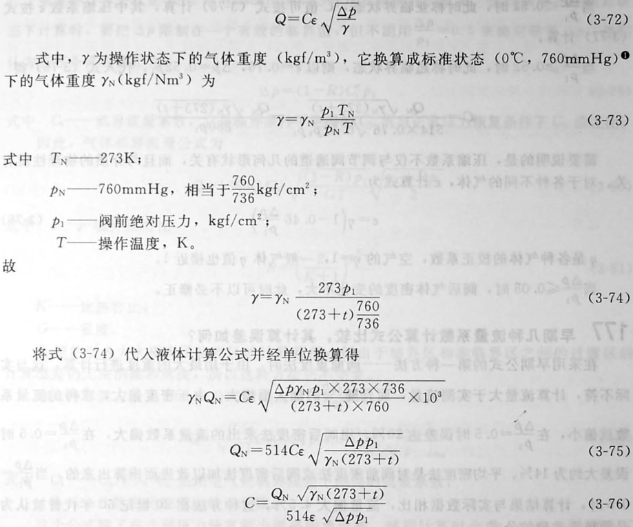 對不可壓縮流體——液體的一般計算公式,各個都差異不大,而對于可壓縮流體則不同。可壓縮流體流量系數的計算比一般液體要復雜,其原因是可流體經節流之后體積膨脹、密度減小,而且在P1不變和△P增加到一定程度時,通過節流孔后會達到臨界狀態,產生阻塞流,因此必須考慮這些因素的影響而對計算公式加以修正。主要的氣體流量系數計算公式見表3-5。