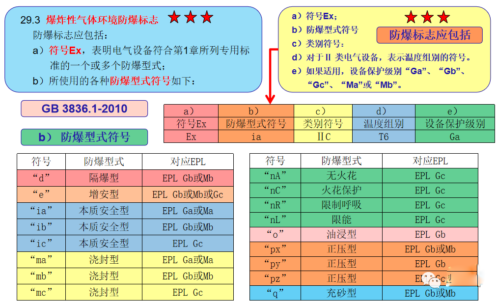 GB 3836.1-2010 爆炸性環境 第1部分:設備 通用要求29.14 標志示例 易產生瓦斯的煤礦用隔爆外殼“d”(EPL Mb):Ex d Ⅰ Mb 或 Ex db Ⅰ。 帶本質型“i”(EPL Ga)輸出電路的隔爆外殼Ex元件“d”(EPL Gb),用于除易產生煤礦瓦斯氣體外的C級爆炸性氣體環境(防爆合格證編好后加符號“U”):Ex d[ia Ga] ⅡC Gb 或 Ex db [ia] ⅡC。 使用增安型“e”(EPL Gb)和正壓外殼“px”型(EPL Gb)的電氣設備,高表面溫度125℃,用于除易產生瓦斯的煤礦外的、引燃溫度高于125℃的爆炸性氣體環境,在防爆合格證中注明使用的具體條件(防爆合格證編好后加符號“X”):Ex e px ⅡC 125℃(T4)Gb 或 Ex eb pxb ⅡC 125℃(T4) 使用隔板外殼“d”(EPL Mb和Gb)和增安型“e”(EPL Mb和Gb)的煤礦用電氣設備和用于除易產生瓦斯的煤礦外的B級氣體、引燃溫度高于200℃的爆炸性氣體環境:Ex de Ⅰ Mb 或 Ex db eb ⅠEx de ⅡB T3 Gb 或 Ex db eb ⅡB T3 用于除易產生瓦斯的煤礦外的、僅存在氨氣爆炸性氣體環境用的隔爆外殼電氣設備“d”(EPL Gb):Ex d Ⅱ氨(NH3)Gb 或 Ex db Ⅱ氨(NH3) 用于具有導電性粉塵的爆炸性粉塵環境ⅢC等級澆封型電氣設備“ma”(EPL Da),高表面溫度低于120℃:Ex ma ⅢC T120℃ Da 或 Ex ma ⅢC T120℃ IP68 用于具有導電性粉塵的爆炸性粉塵環境ⅢC等級“ia”(EPL Da)型電氣設備,高表面溫度低于120℃:Ex ia ⅢC T120℃ Da 或 Ex ia ⅢC T120℃ IP20 用于具有導電性粉塵的爆炸性粉塵環境ⅢC等級“p”(EPL Db)型電氣設備,高表面溫度低于120℃:Ex p ⅢC T120℃ Db 或 Ex pb ⅢC T120℃ IP65 用于具有導電性粉塵的爆炸性粉塵環境ⅢC等級“t”(EPL Db)型電氣設備,高表面溫度低于225℃,當用500mm的粉塵層試驗時低于320℃:Ex t ⅢC T225℃ T500 320℃ Db 或 Ex tb ⅢC T225℃ T500 320℃ IP65