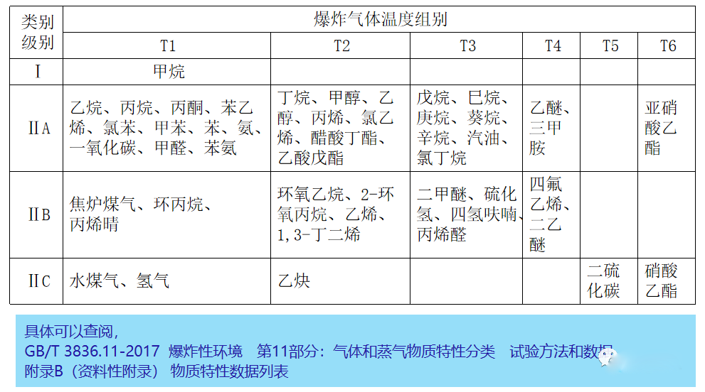 分類、分級、分組:按照氣體/粉塵類型和特性劃分,防爆電氣設備的級別和組別不應低于該爆炸性環境內可燃物質的級別和組別。