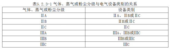 防爆電氣設備的級別和組別不應低于該爆炸性氣體環境內爆炸性氣體混合物的級別和組別。氣體、蒸氣或粉塵分級與電氣設備類別的關系應符合表5.2.3-1的規定: