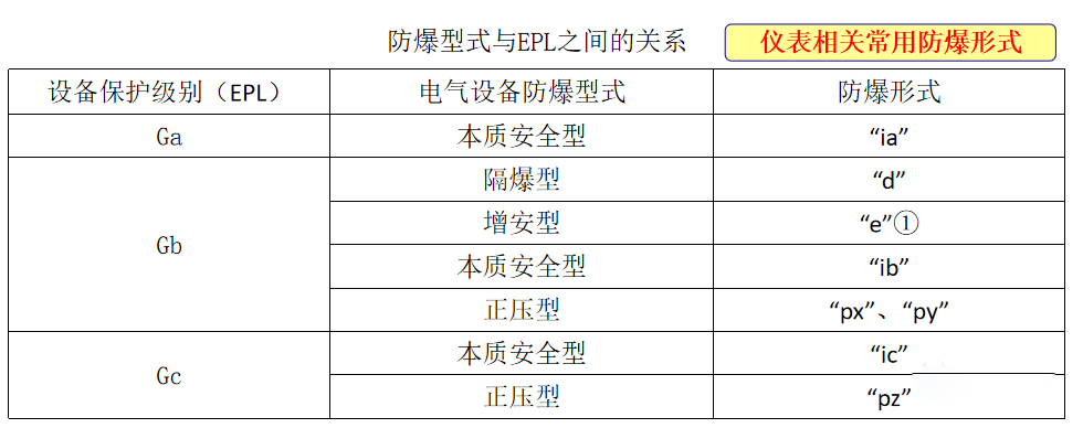 確認電氣設備保護級別(EPL)與電氣設備防爆型式常用防爆儀表的電氣設備保護級別(EPL)與電氣設備防爆型式的關系應符合下表: