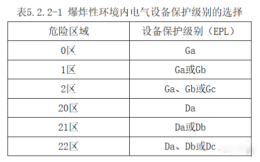 5.2.2 危險區域劃分與電氣設備保護級別的關系應符合下列規定: