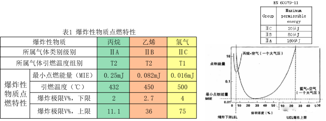 爆炸性氣體物質不同點燃特性的舉例見表1。