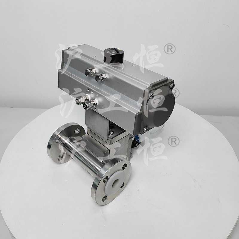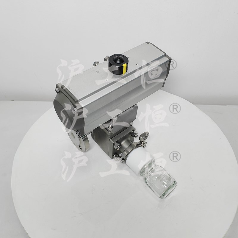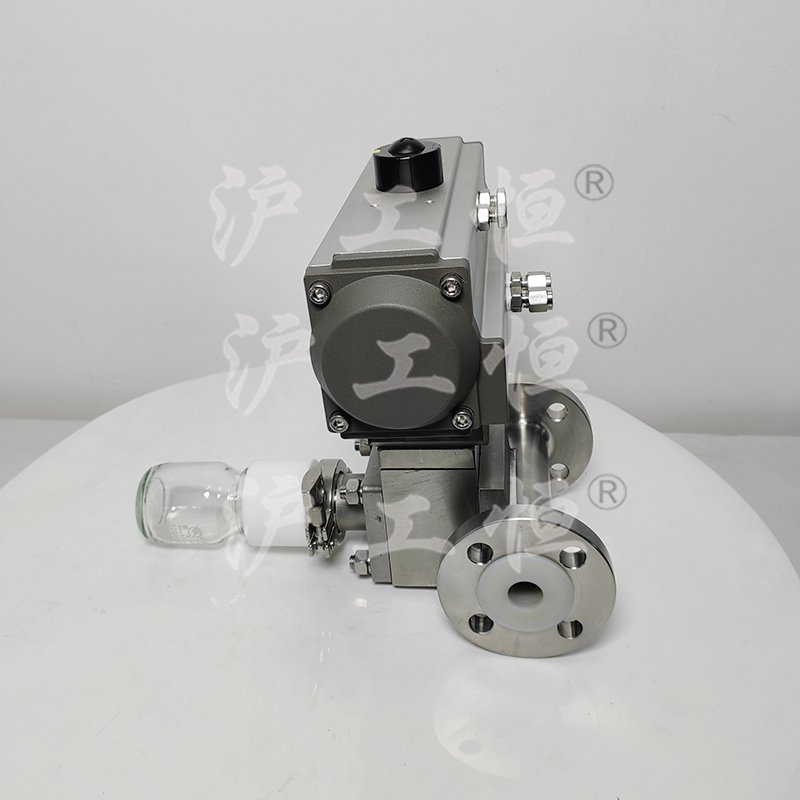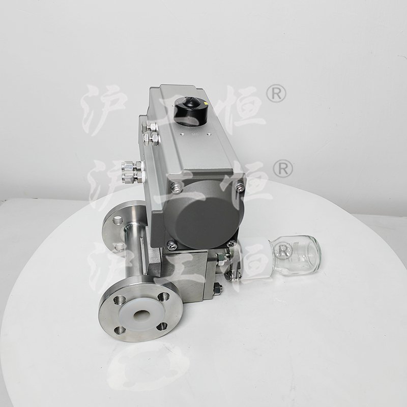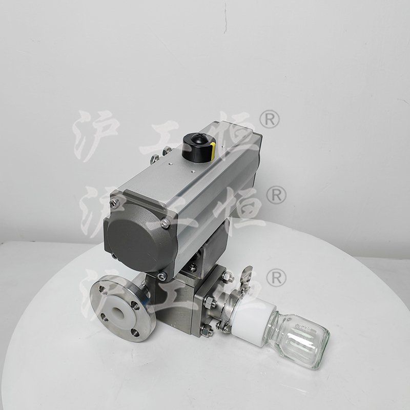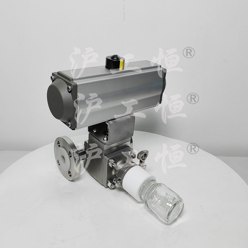 GHQZXQYF46-16RL氣動襯氟定量取樣閥采用全襯氟設計,可以在腐蝕性工況的取樣,解決特材造價高的問題,GHQZXQYF46-16RL氣動襯氟定量取樣閥主要有襯氟閥體、襯氟閥芯、襯氟閥桿、閥座、氣動執行機構、取樣瓶組成,取樣瓶為可拆卸設計,試樣進入取樣瓶內,可將取樣瓶密封,避免污染試樣,流道無流阻設計,不影響流量,閥桿通過手柄、電動執行機構、氣動執行機構旋轉帶動閥桿及閥芯使試樣進入閥芯內,通過旋轉閥芯180°實現試樣進入取樣瓶內,放樣的同時,閥芯將取樣口關閉,從而做到零泄漏及無壓取樣,不會因開關閥門對取樣瓶造成壓力沖擊,從而保證操作者的安全。取樣瓶可選透明和避光兩種,本取樣閥廣泛應用在制藥、化工、食品行業。
