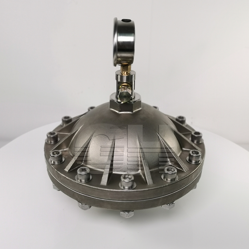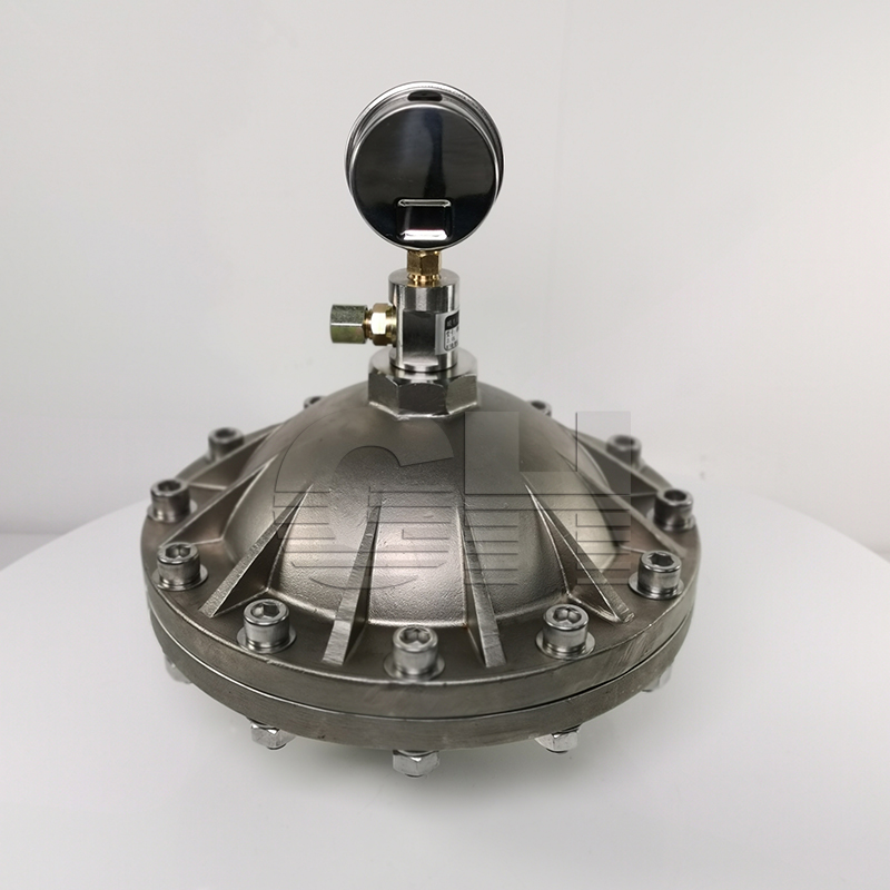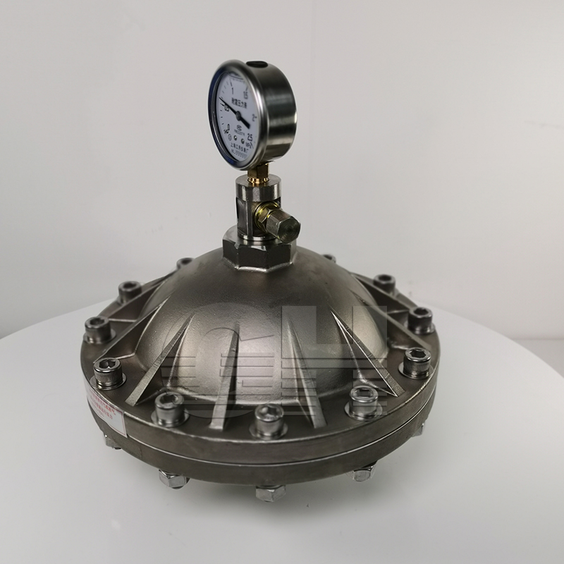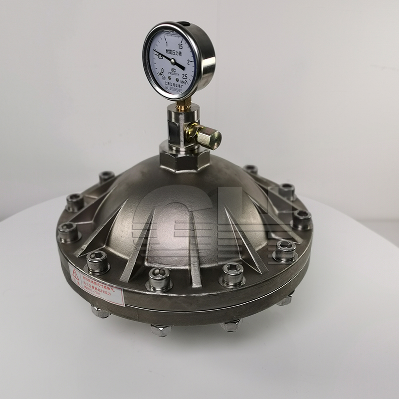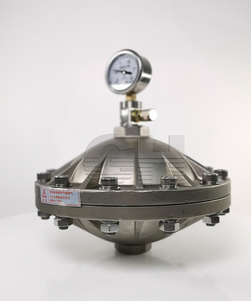 膜片式脈沖阻尼器分為上下殼體,中間由聚四氟乙烯&橡膠復合膜片分隔,是常用的脈沖阻尼器。 的***點就是隔膜將預充氣體和管路中的液體分開,方便維護,在合適的選型、充壓條件下,能夠減少 大多數的脈沖。我公司生產的膜片式脈沖阻尼器PVC材質的 耐壓為1.0MPa,不銹鋼材質 耐壓一般為2.5MPa,耐壓5.0MPa。