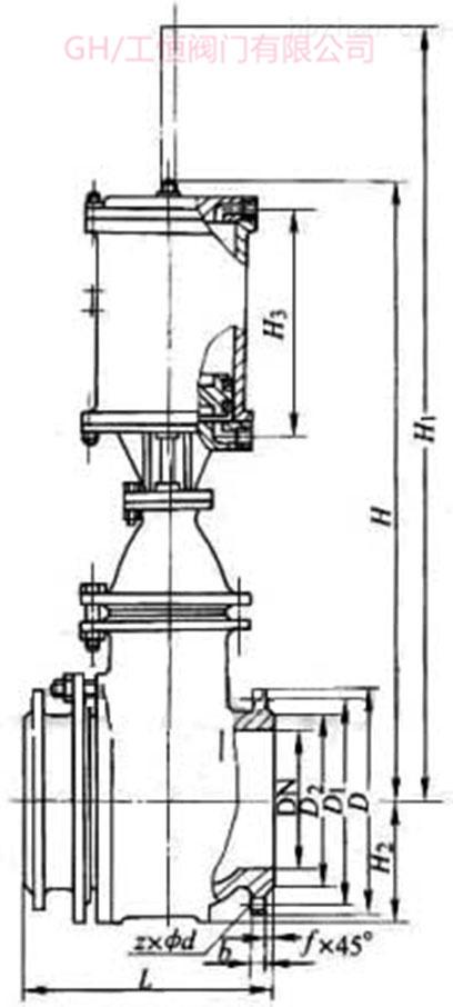 PZ641H-16C 型氣動鋼制排渣閘閥主要外形及結構尺寸(mm)| DN | L | D | D1 | D2 | z×Φ | b | f | H3 | H2 | H | H1 | 重量/kg |